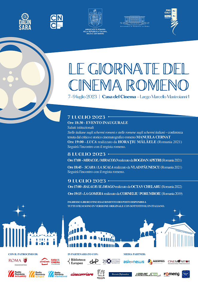 În perioada 7-9 iulie 2023, Ambasada României în Republica Italiană, Asociația Dacin Sara din București, Centrul Național al Cinematografiei din București, Accademia di Romania in Roma și ProEvent – Roma, în parteneriat cu Casa del Cinema – Roma, Biblioteca Europea – Roma și Digital World Printing – Roma și cu patronajul Primăriei Romei – Departamentul de Cultură, organizează Zilele Filmului Românesc 2023 la Casa del Cinema din Roma.